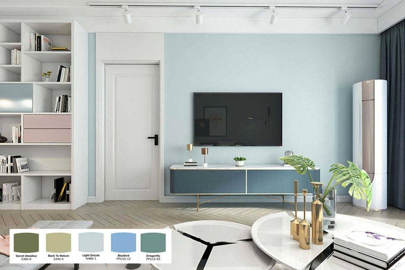 Trong phòng khách, bạn có thể dùng trắng hoặc ghi sáng làm màu nền, sau đó thêm gối tựa màu xanh dương, rèm tông khói hoặc tranh có yếu tố nước để tạo điểm nhấn. Cách phối này vừa hiện đại vừa thoáng mắt.